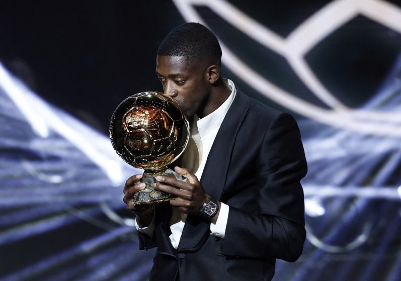 凭借这段推动球队走向辉煌的表现,28岁的登贝莱在周一晚的巴黎颁奖礼上,站上了足球世界的个人荣誉之巅。他成为继科帕、普拉蒂尼、帕潘、齐达内和本泽马之后,第六位获此殊荣的法国球员,也是自1991年马赛的帕潘以来,首位在效力法国俱乐部期间获奖的球员。