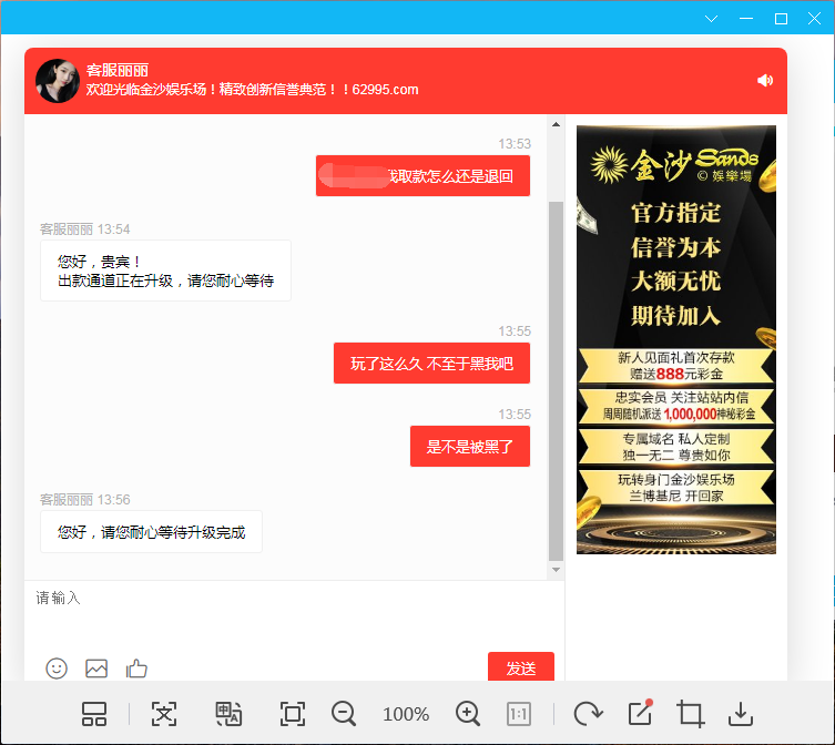 这个台子已经玩了3.4年了,期间出款一直很稳定。也取过大额。3.12日 充了3万,中间赢到17万。取款,等了半小时还没有到就去问客服。客服说系统升级。也没说多久才能升级完成,。今天去问还是一直在升级,是不是被黑了。